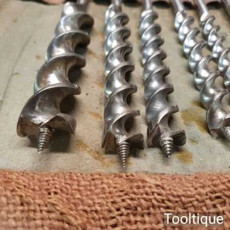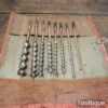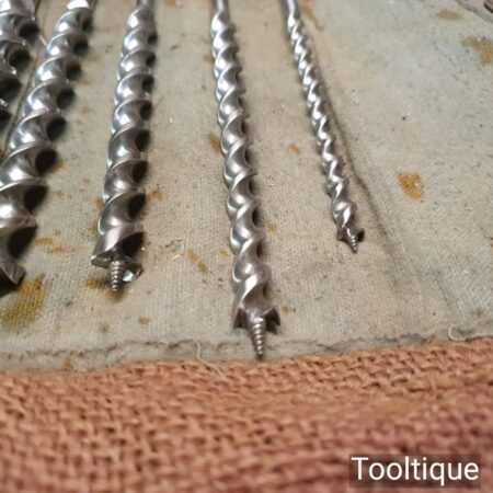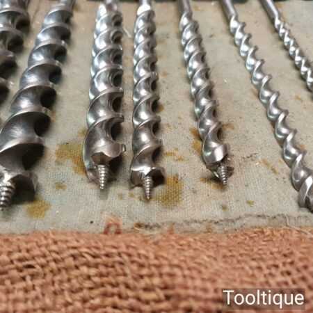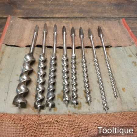 Vintage set of 8 No: double spur screw auger bits by Wm. Ridgeway ranging between 1/4” – 1 ¼” in a canvass roll, sharpened ready for use and in good used condition.