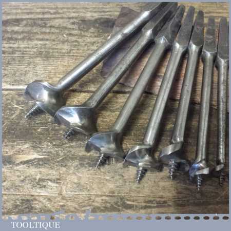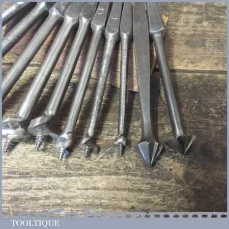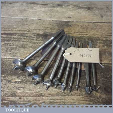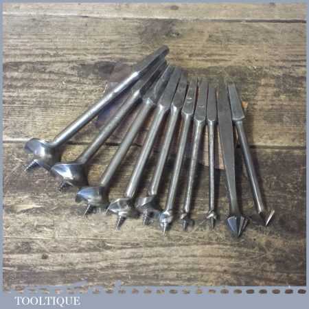 Vintage set of 8 No: single wing screw centre bits (5/16” – 1 ¼”) + 2 No: countersink bits by various makers ranging between 5/16” – 1 ½”, in good used condition.