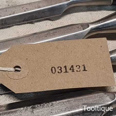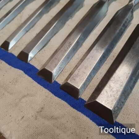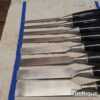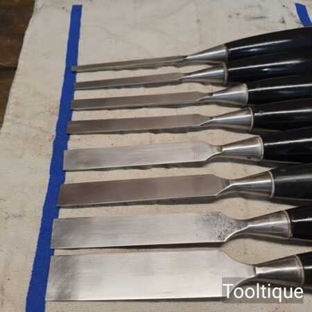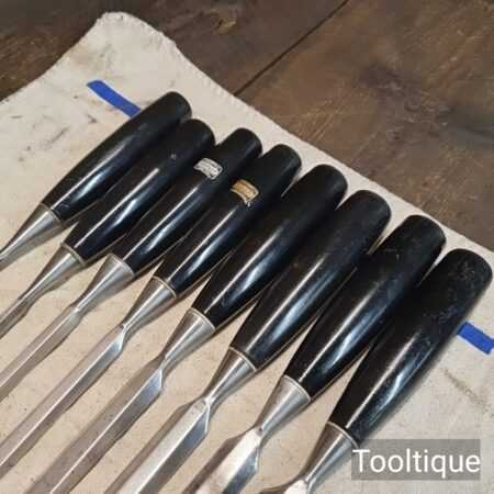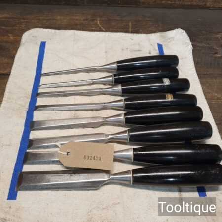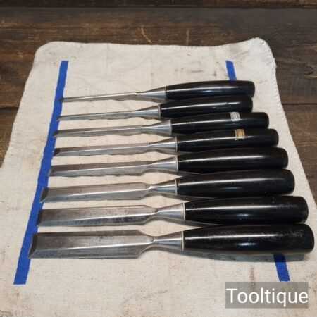 Vintage set of 8 No: Stanley England No: 5001 bevelled edge chisels, fully refurbished ready for use and in good used condition. All refurbished chisels are water cooled during the sharpening & flattening process to ensure the tempering is not affected.