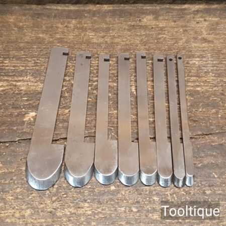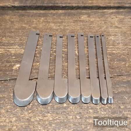 Vintage Set of 8 Record Fluting cutters (¾”, ⅝”, ½”, ⁷⁄₁₆, ⅜”, ⁵⁄₁₆, ¼”, ³⁄₁₆) for 405 combination plane in good used condition. Unused condition.