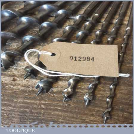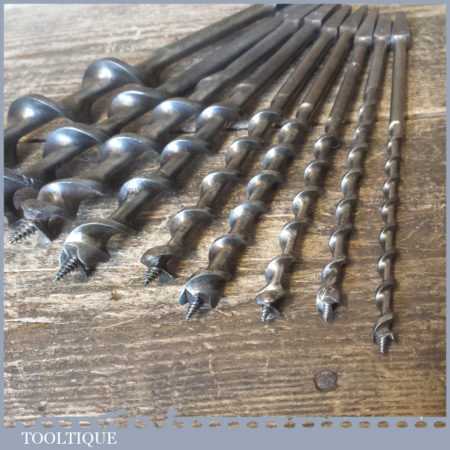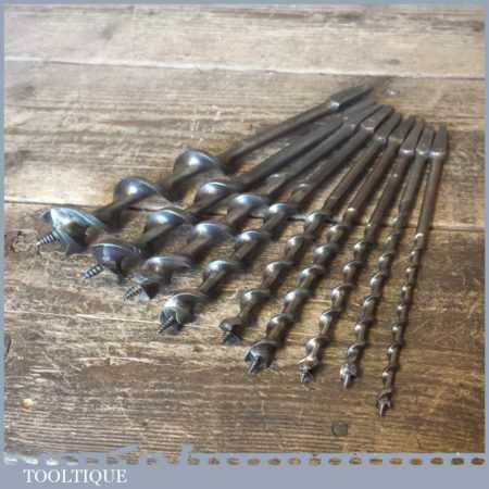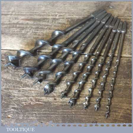 Vintage set of 9 No: double spur screw auger bits by various makers ranging between ¼ ” – 1” in good used condition.