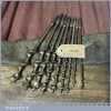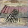 Vintage set of 9 No: double spur screw auger bits (8 No: by Irwin USA & 1 No: by ridgeway) ranging between 1/4” – 1” in a simulated leather roll, in good used condition.