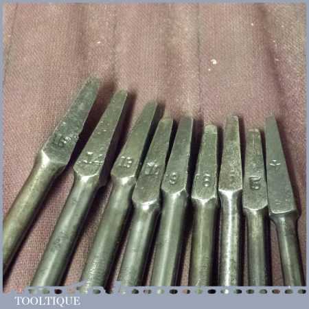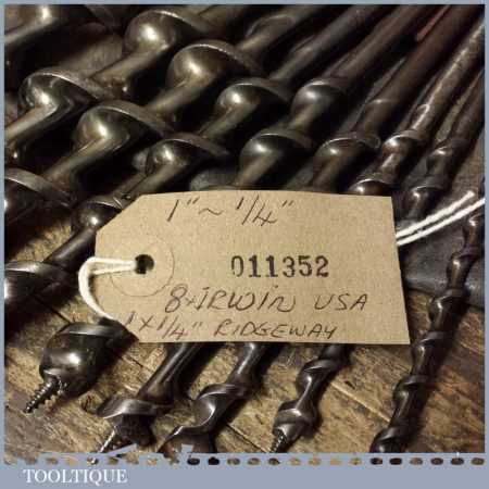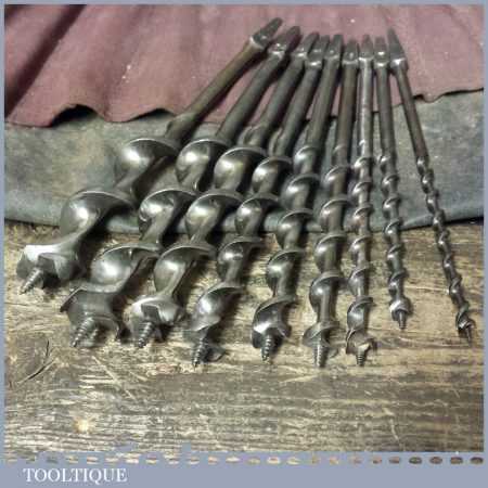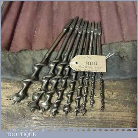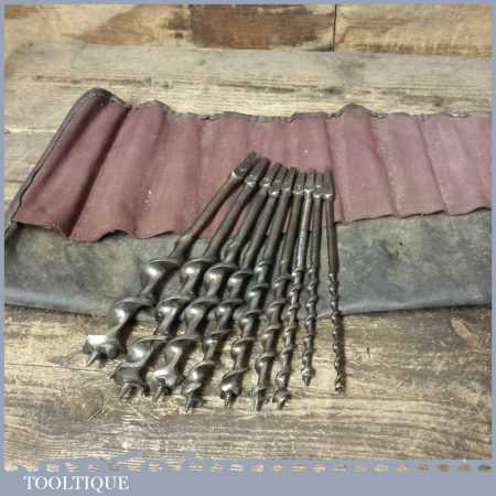 Vintage set of 9 No: double spur screw auger bits (8 No: by Irwin USA & 1 No: by ridgeway) ranging between 1/4” – 1” in a simulated leather roll, in good used condition.