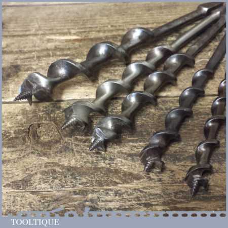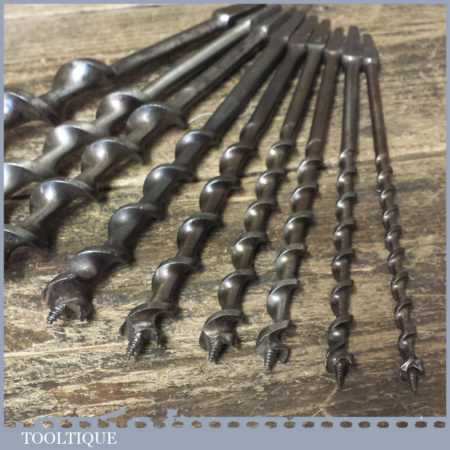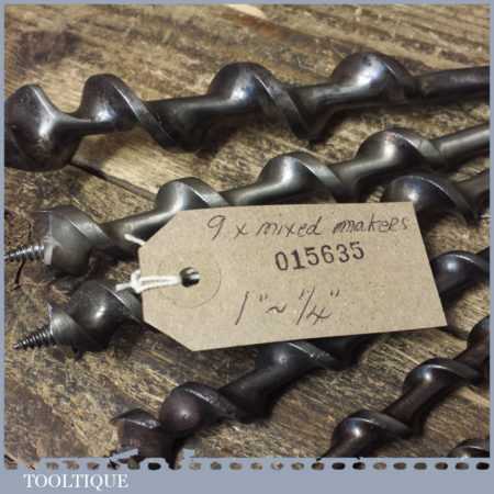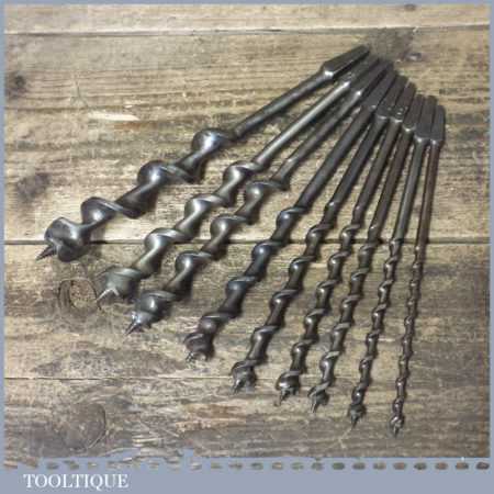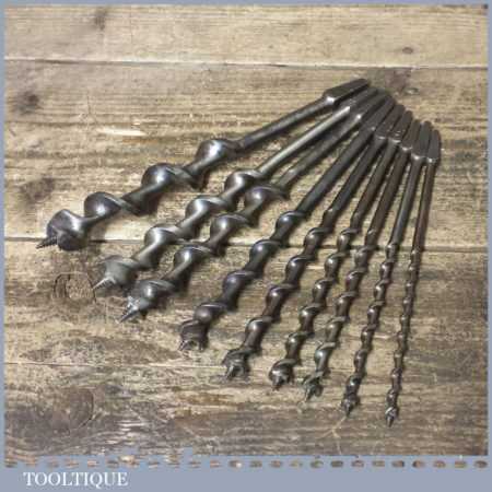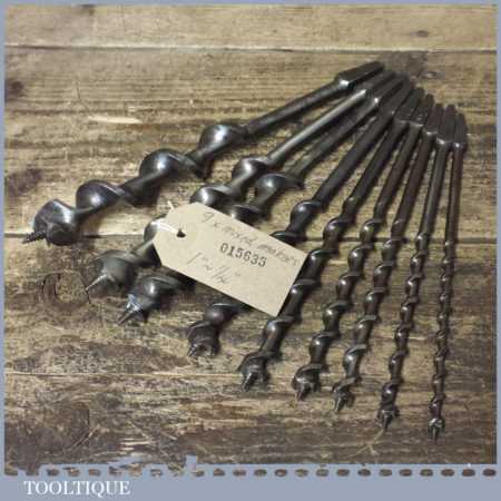 Vintage set of 9 No: double spur screw auger bits by various makers ranging between 1/4” – 1”, in good used condition. These have been sharpened ready for use.