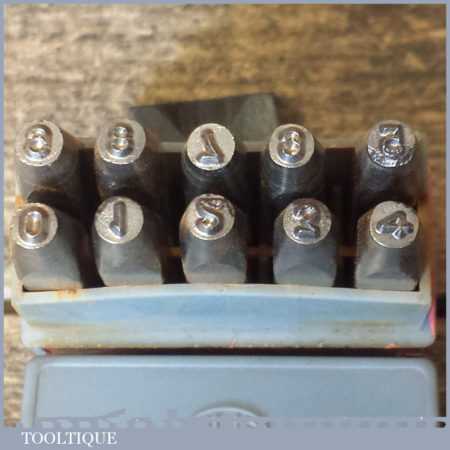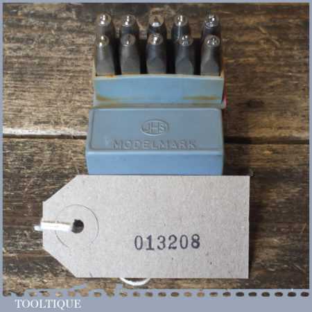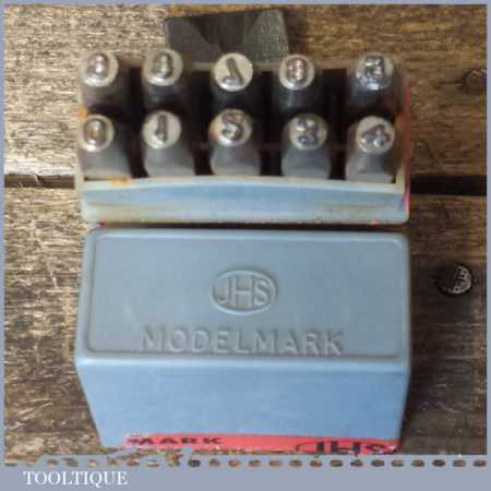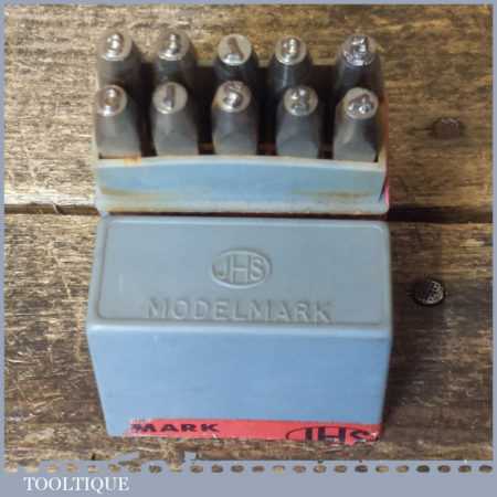 Vintage set of JHS Devon Modelmark 3/32” or 2.5 mm 0-9 number stamps in original box and in good used condition.