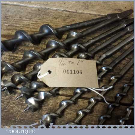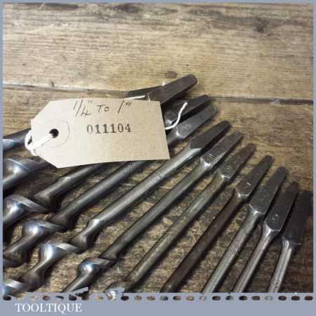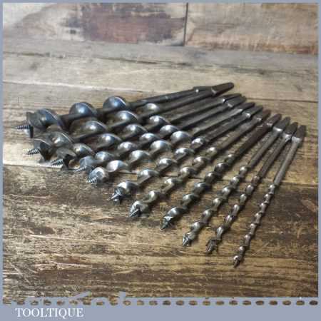 Vintage set of 11 No: screw auger bits by various makers ranging between 1/4” – 1” in good used condition.