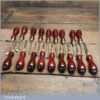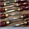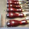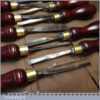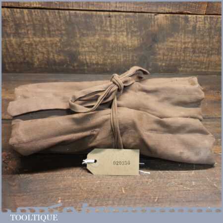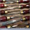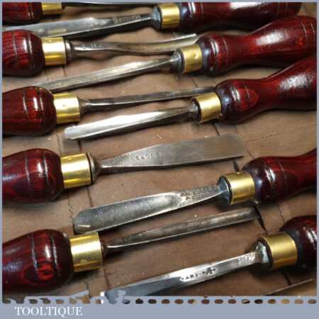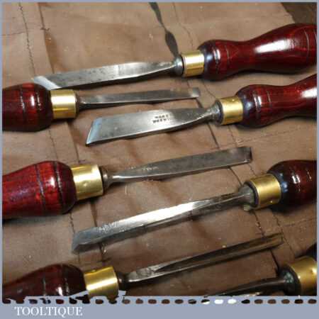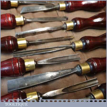 Vintage set of 18 No: wood carving palm chisels by various makers with hardwood handles all in a canvas roll, in good used condition fully refurbished sharpened and honed ready for use. This set has been created and from a selection of old makers that needed to be re-handled and this is the result.