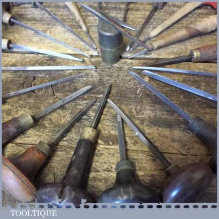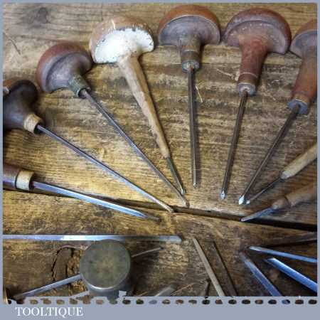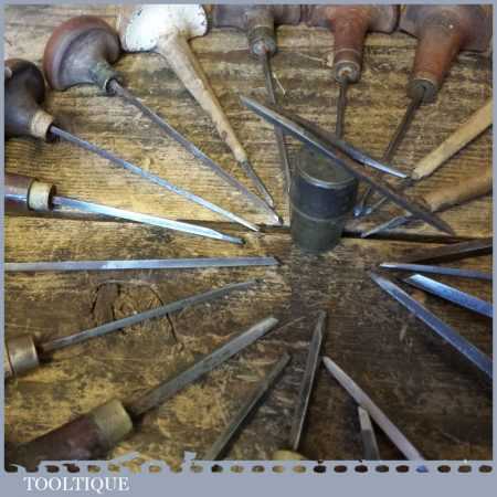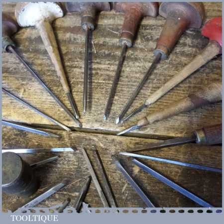 Vintage set of 20 No: engravers or gravers tools complete with 2 extra cutters and a round brass tool possibly used for burnishing in good used condition. This set comes in an old metal lined box with lid as photographed.