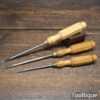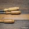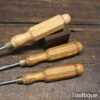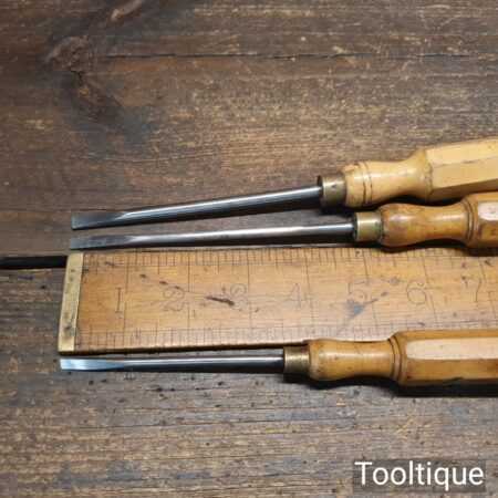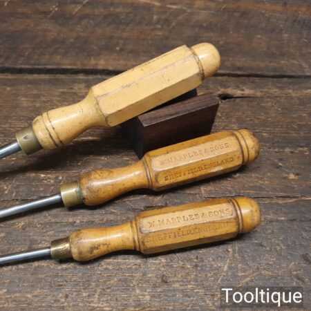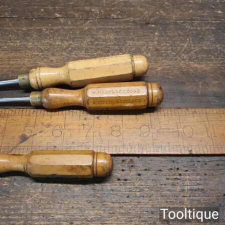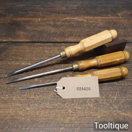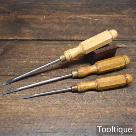 Vintage set of 3 slimline flat screwdrivers with ¼” + 3/16” + 5/32” wide ends and boxwood London pattern handles. The screwdrivers have redressed heads using water cooled process and they are in good used condition.
