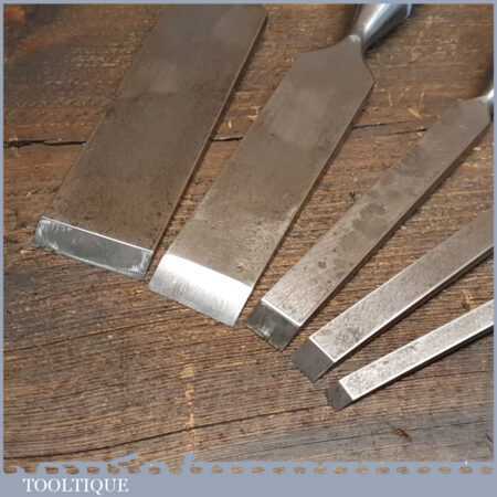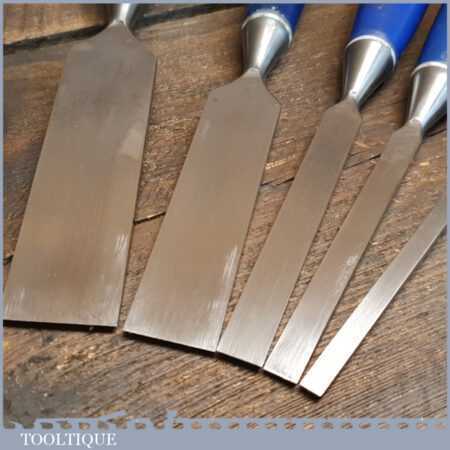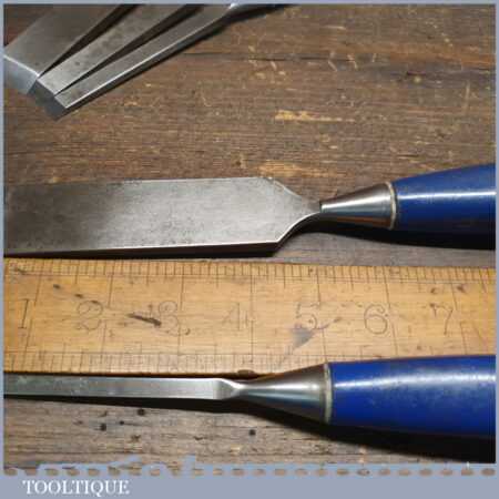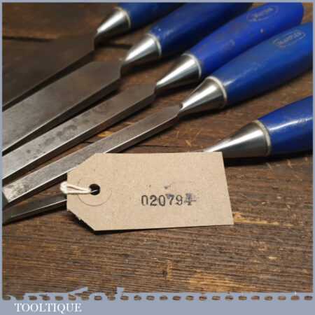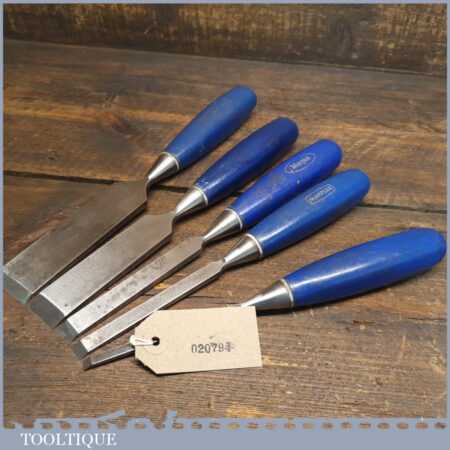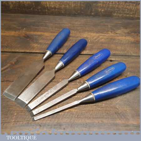 Vintage set of 5 No: Marples Blue Chip firmer chisels (1/4”, 3/8”, 1/2”, 1” & 1 ¼”) with composite handles, in good used condition and ready for use.