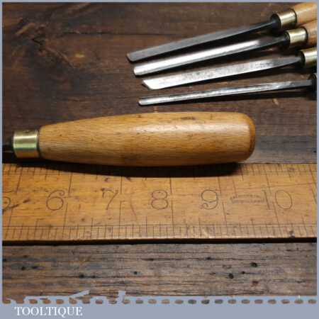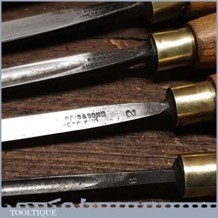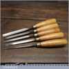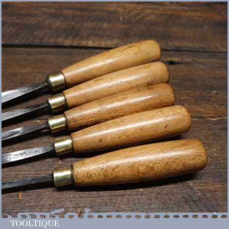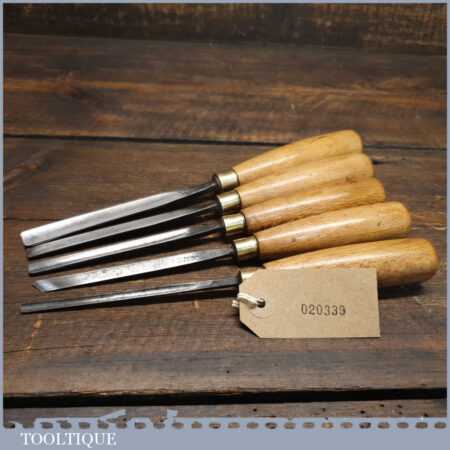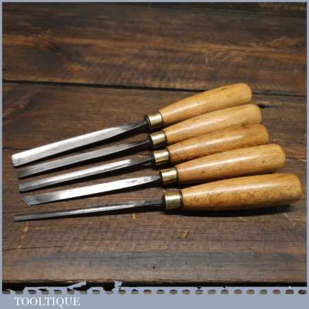Vintage set of 5 No: J. B. Addis & Sons wood carving chisels with beechwood handles in good used condition, fully refurbished sharpened and honed ready for use.