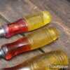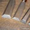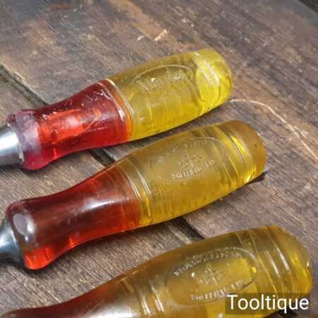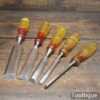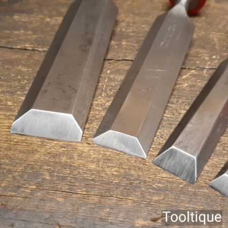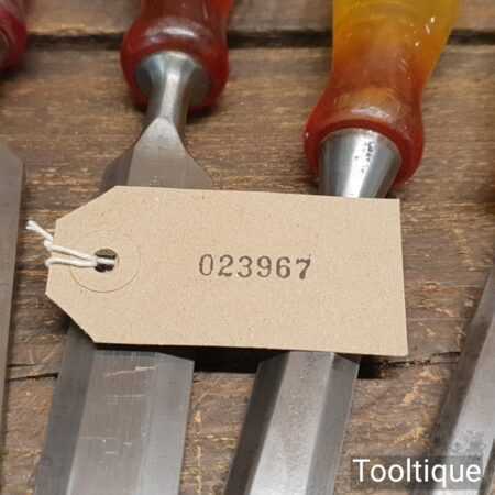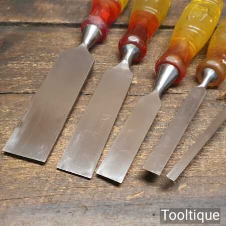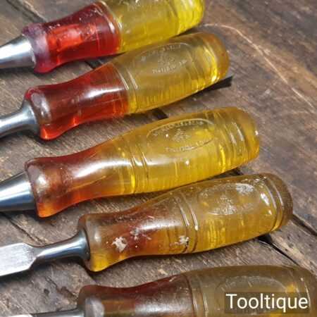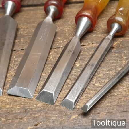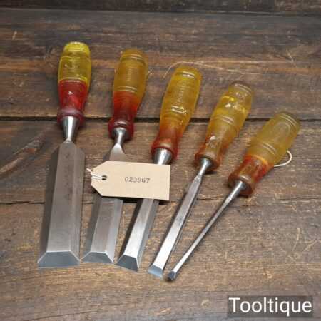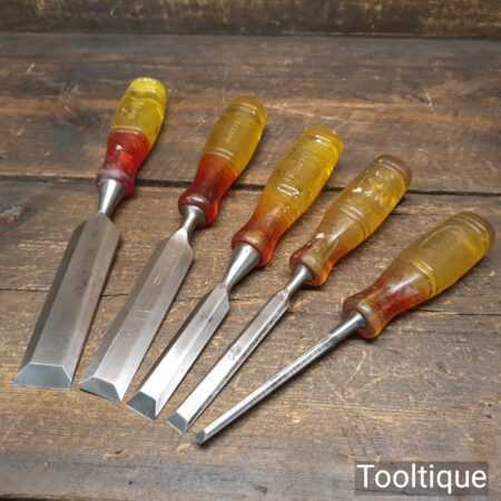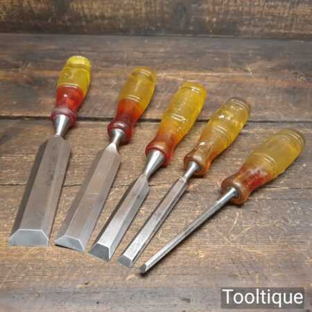 Vintage set of 5 No: Marples carpenter’s bevel edge chisels (1/4”, 1/2”, 3/4”, 1” & 1 ¼”) with shockproof handles in good used condition, fully refurbished sharpened and honed ready for use. Note: the 1 ¼” chisel is a later version. All refurbished chisels are water cooled during the sharpening process to ensure the tempering is not affected.