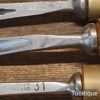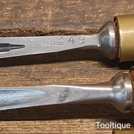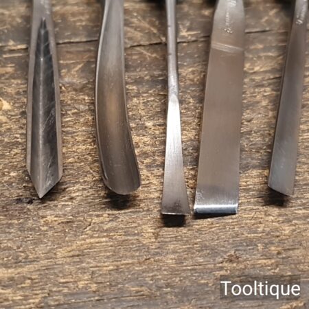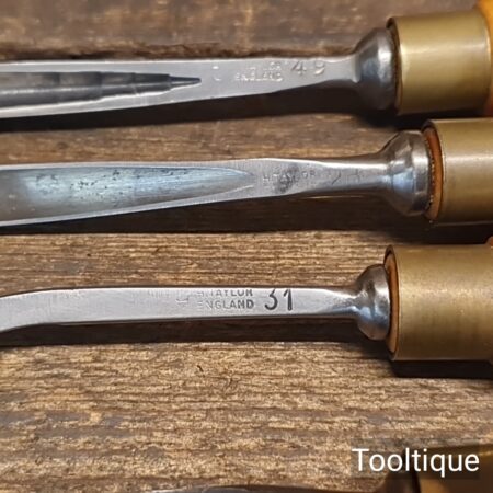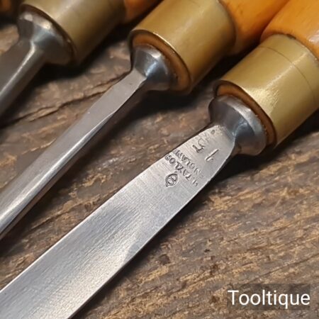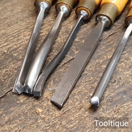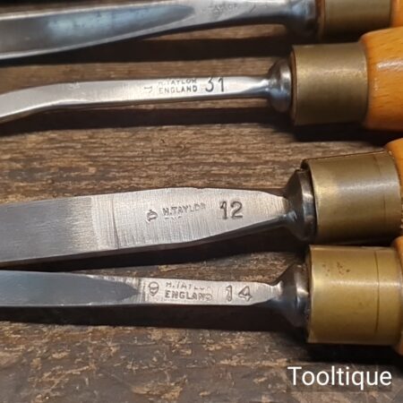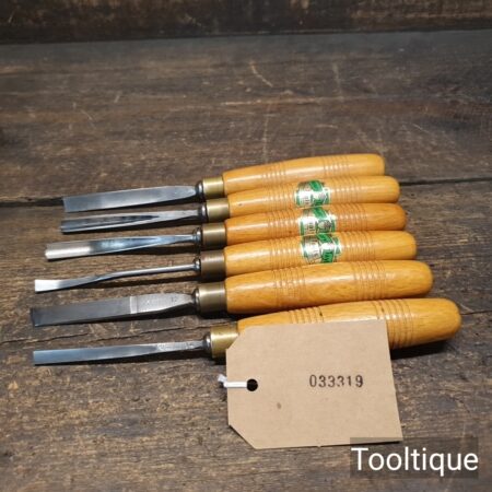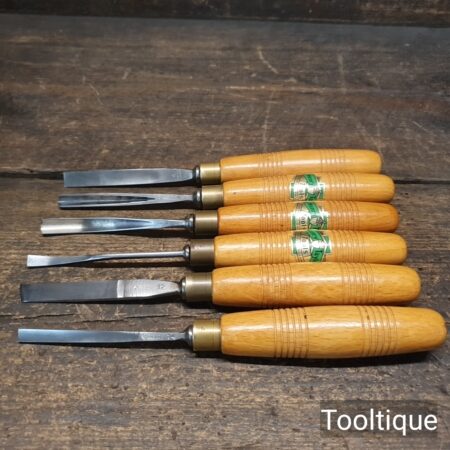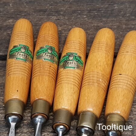 Vintage Set of 6 No: Henry Taylor Woodcarving Chisels with Beechwood handles, sharpened ready for use and in good used condition.