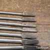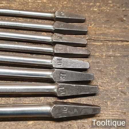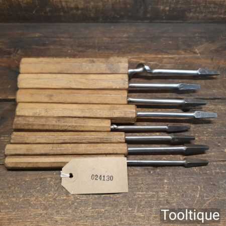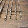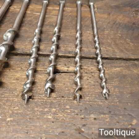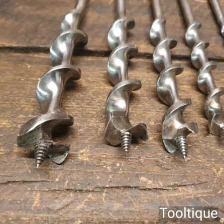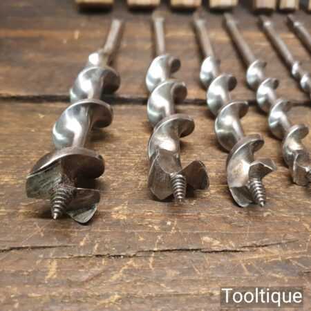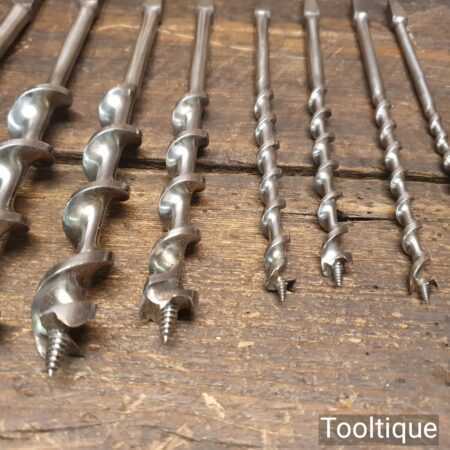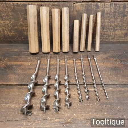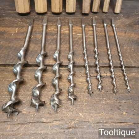 Vintage set of 8 No: double spur screw auger bits by various makers ranging between 1/4” – 1” with protective beechwood shields, sharpened ready for use and in good used condition