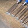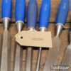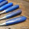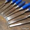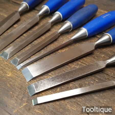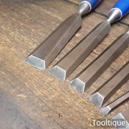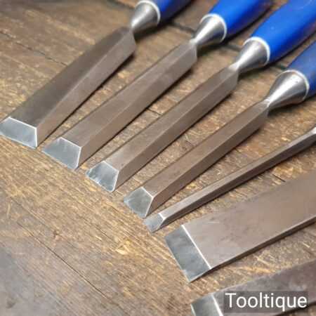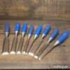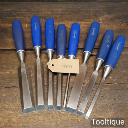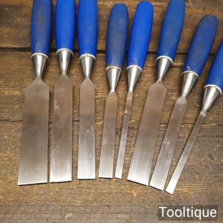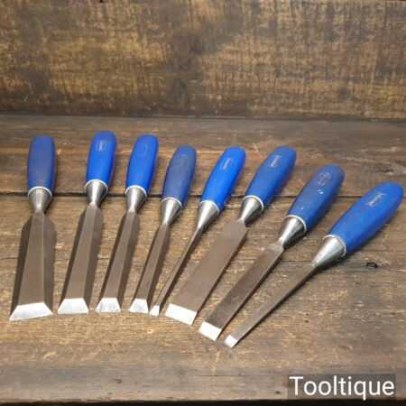 Vintage set of 8 No: Marples blue Chip chisels including 5 No: bevel edge (3/8”, 1/2”, 5/8”, 3/4” & 1”) and 3 No: firmer (1/4”, 1/2” and 3/4”) with plastic handles in good used condition, fully refurbished sharpened and honed ready for use. All refurbished chisels are water cooled during the sharpening process to ensure the tempering is not affected.