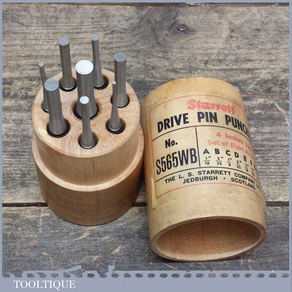 Vintage set of 8 Starrett S565WB Drive Pin punches in original wooden tube holder and in good condition. Sizes from 1/16” to 5/16”.