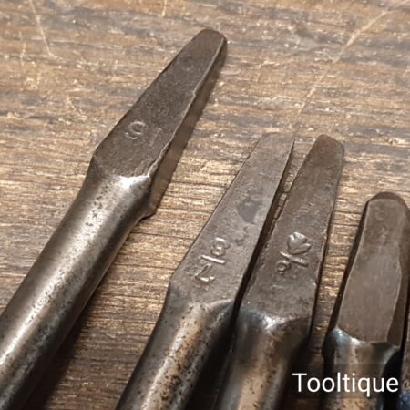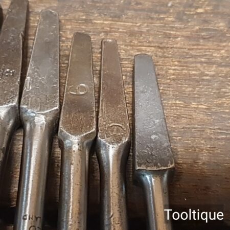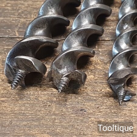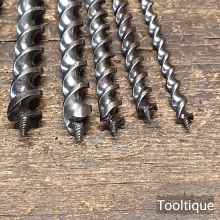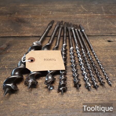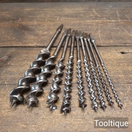 Vintage Set of 9 No: Jenning Pattern Carpenters Brace Auger Bits, refurbished ready for use and in good used condition. Note: Sharpened Various makers, different sizes between ¼” – 1”.