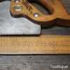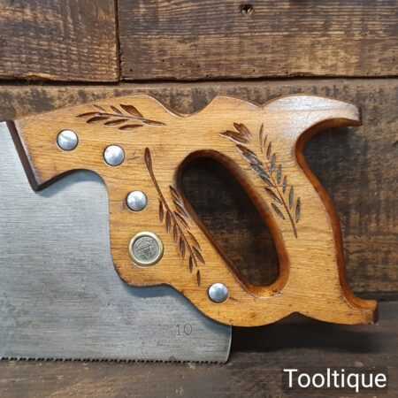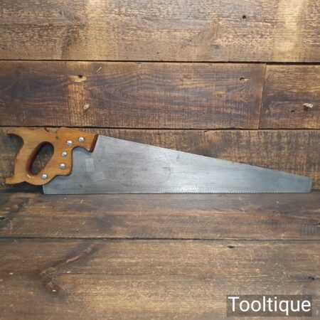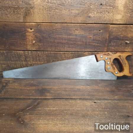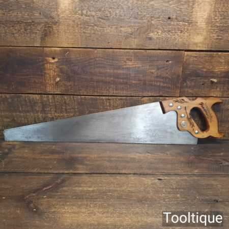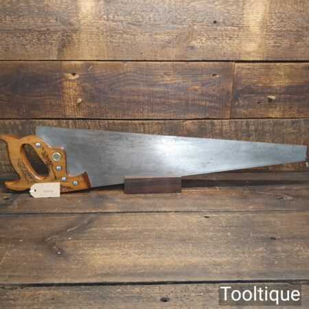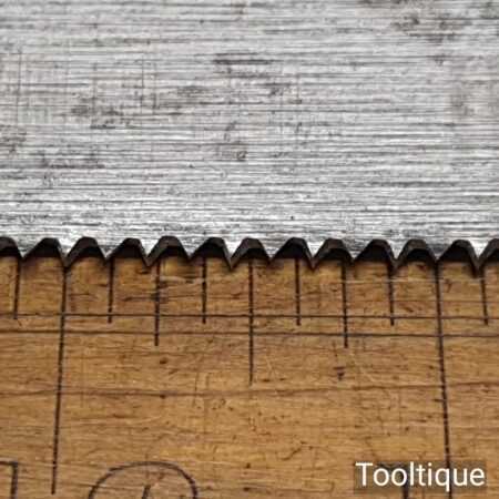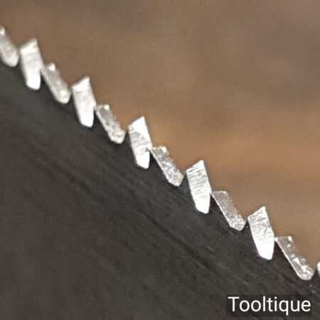 The saw has been thoroughly cleaned, jointed, resharpened and set by hand so that all the hard work of getting an old vintage saw right has been undertaken. We do this so that the next sharpening is easier and no more than a quick freshen up would be required. Those who are familiar with sharpening will know this is no small job and requires skill, effort and time to achieve good results.