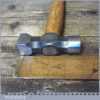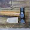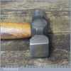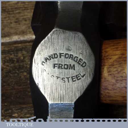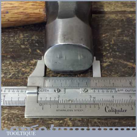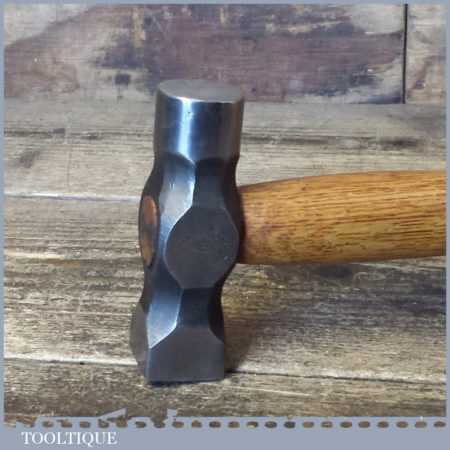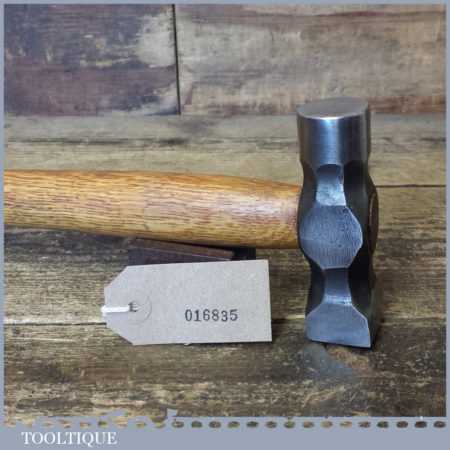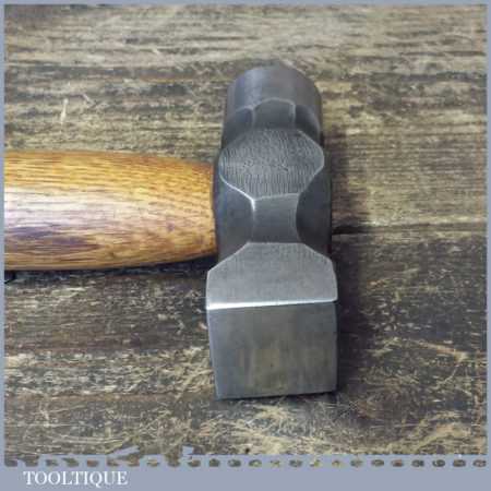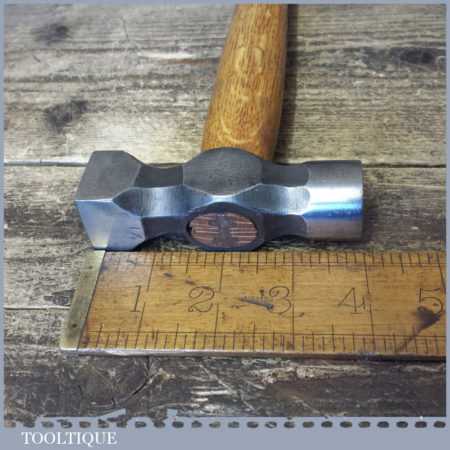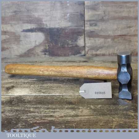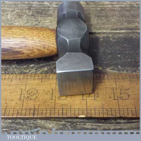 Vintage sheet metal worker’s square and round-faced hammer in good used condition. Head faces have been restored to a smooth polished finish. This has been re-handled and weighs 1.40 oz