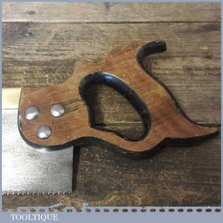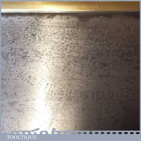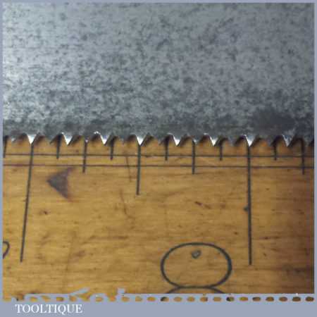 The saw has been thoroughly cleaned including under the handle, jointed, resharpened and set by hand so that all the hard work of getting an old vintage saw right has been undertaken. We do this so that the next sharpening is easier and no more than a quick freshen up would be required. Those who are familiar with sharpening will know this is no small job and requires skill, effort and time to achieve good results.
