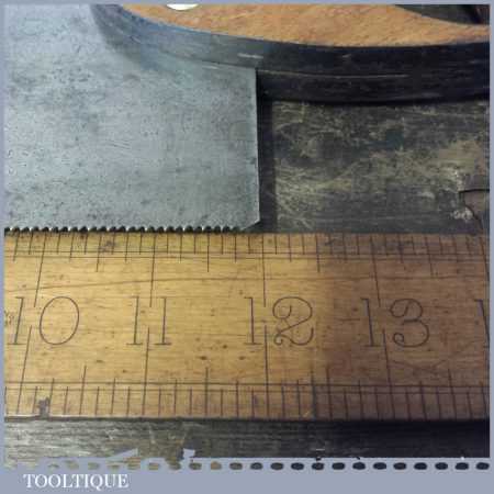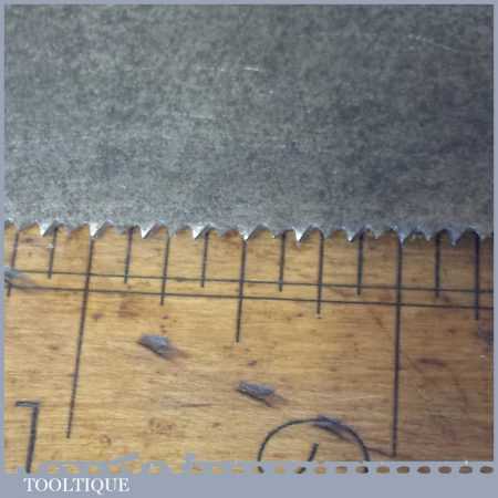 The saw has been thoroughly cleaned, jointed, resharpened and set by hand so that all the hard work of getting an old vintage saw right has been undertaken. We do this so that the next sharpening is easier and no more than a quick freshen up would be required. Those who are familiar with sharpening will know this is no small job and requires skill, effort and time to achieve good results.
