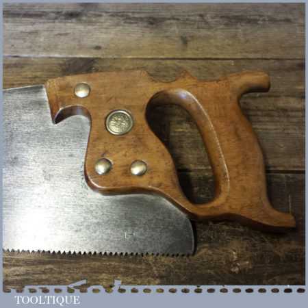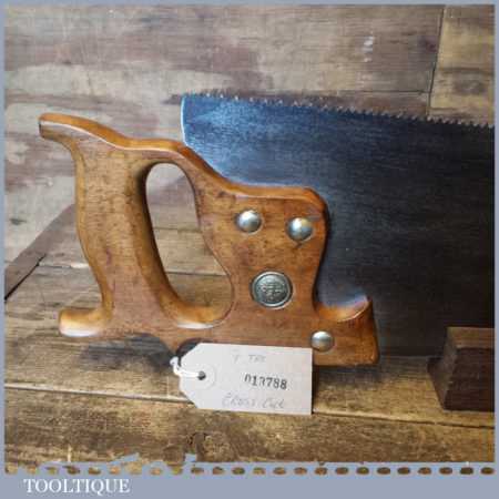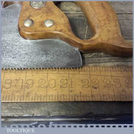 The saw has been thoroughly cleaned, jointed, resharpened and set by hand so that all the hard work of getting an old vintage saw right has been undertaken. We do this so that the next sharpening is easier and no more than a quick freshen up would be required. Those who are familiar with sharpening will know this is no small job and requires skill, effort and time to achieve good results.