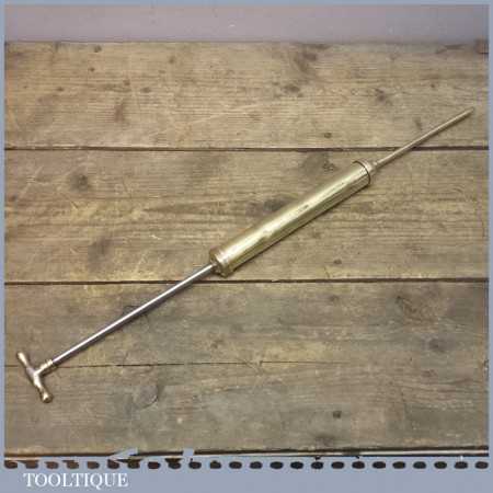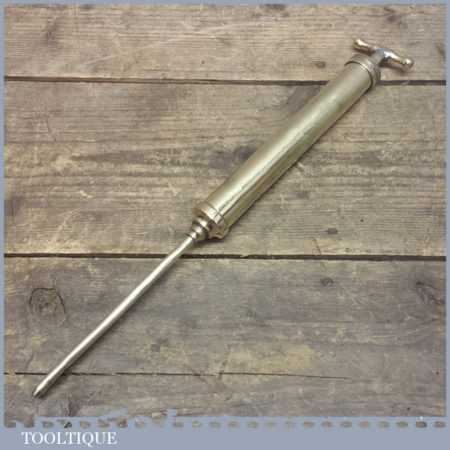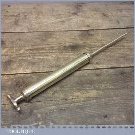 Vintage solid Brass grease gun measuring a total of 14” long, its does have a few bumps and bruises see images but it is an unusual design.