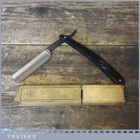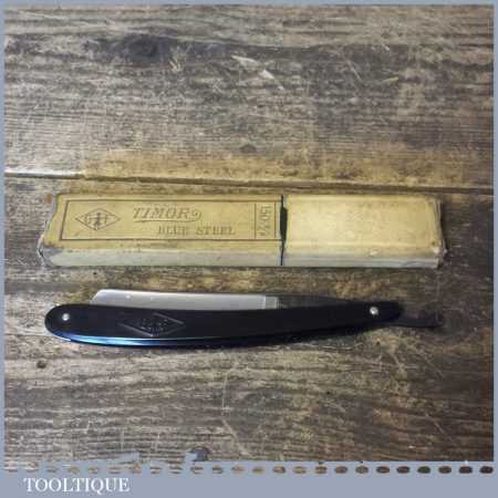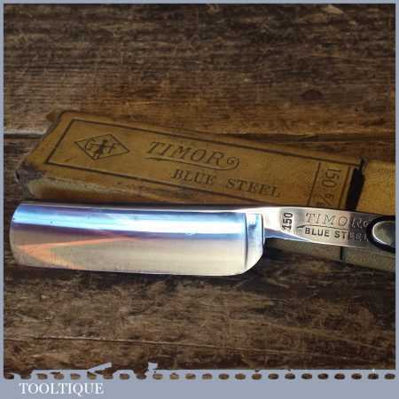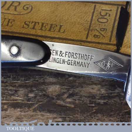 Vintage Solingen Germany Giesen & Forsthoff “Timor” blue steel cut throat razor and box in good used condition
