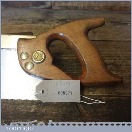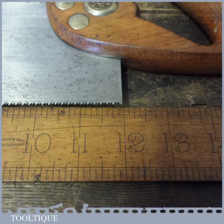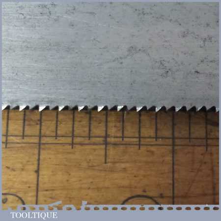 The saw has been thoroughly cleaned, jointed, resharpened as a rip and set by hand so that all the hard work of getting an old vintage saw right has been undertaken. We do this so that the next sharpening is easier and no more than a quick freshen up would be required. Those who are familiar with sharpening will know this is no small job and requires skill, effort and time to achieve good results.