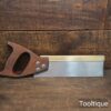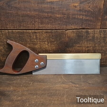Vintage 13Tpi Spear & Jackson 10” Brass Back Dovetail Saw with a Mahogany Handle, sharpened ready for use and in good used condition. The saw has been thoroughly cleaned, jointed, resharpened and set by hand so that all the hard work of getting an old vintage saw right has been undertaken. We do this so that the next sharpening is easier and no more than a quick freshen up would be required. Those who are familiar with sharpening will know this is no small job and requires skill, effort and time to achieve good results.