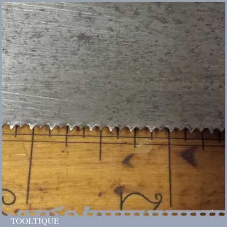 The saw has been thoroughly cleaned, jointed, resharpened and set by hand so that all the hard work of getting an old vintage saw right has been undertaken. We do this so that the next sharpening is easier and no more than a quick freshen up would be required. Those who are familiar with sharpening will know this is no small job and requires skill, effort and time to achieve good results.