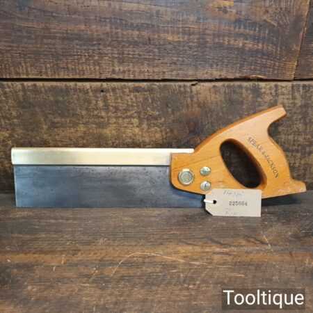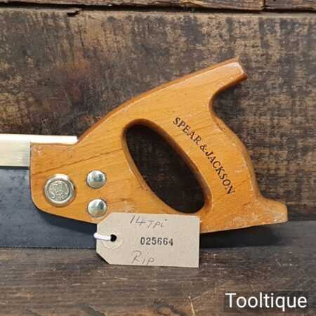 Vintage Spear & Jackson 10” brass back tenon saw with 14 tpi, fully refurbished and sharpened rip ready for use. Note: Light surface pitting to the saw plate but nothing serious that affects its use. Brass Studs.