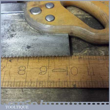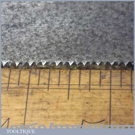 The saw has been thoroughly cleaned, jointed, resharpened and set by hand so that all the hard work of getting an old vintage saw right has been undertaken. We do this so that the next sharpening is easier and no more than a quick freshen up would be required. Those who are familiar with sharpening will know this is no small job and requires skill, effort and time to achieve good results.