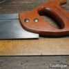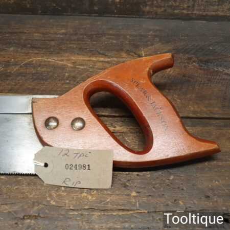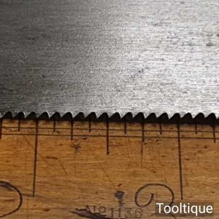 The saw has been thoroughly cleaned, jointed, resharpened, and set by hand so that all the hard work of getting an old vintage saw right has been undertaken. We do this so that the next sharpening is easier and no more than a quick freshen up would be required. Those who are familiar with sharpening will know this is no small job and requires skill, effort, and time to achieve good results.