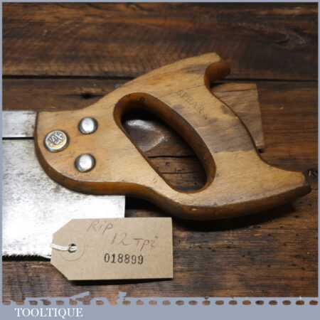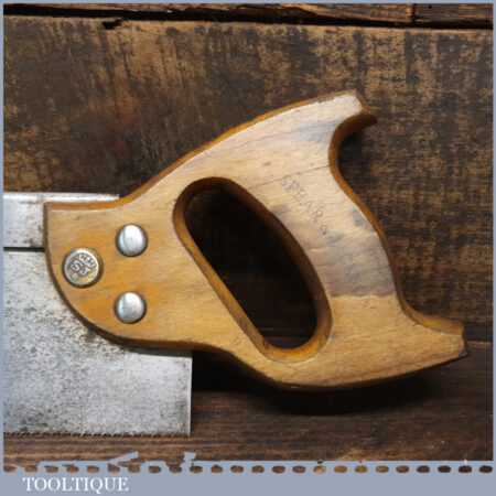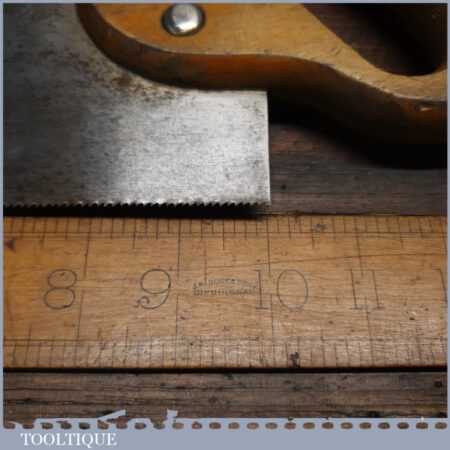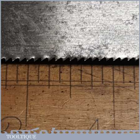 The saw has been thoroughly cleaned including under the handle, jointed, resharpened and set by hand so that all the hard work of getting an old vintage saw right has been undertaken. We do this so that the next sharpening is easier and no more than a quick freshen up would be required. Those who are familiar with sharpening will know this is no small job and requires skill, effort and time to achieve good results