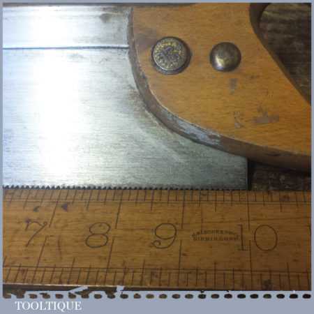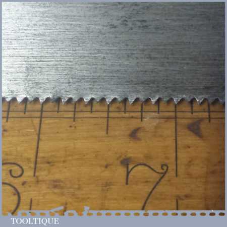 The saw has been thoroughly cleaned, jointed, resharpened and set by hand so that all the hard work of getting an old vintage saw right has been undertaken. We do this so that the next sharpening is easier and no more than a quick freshen up would be required. Those who are familiar with sharpening will know this is no small job and requires skill, effort and time to achieve good results.