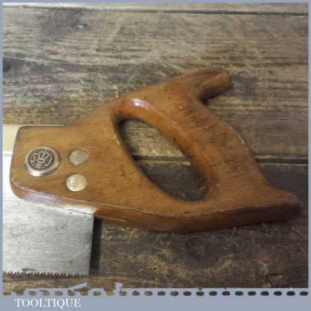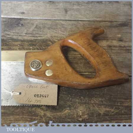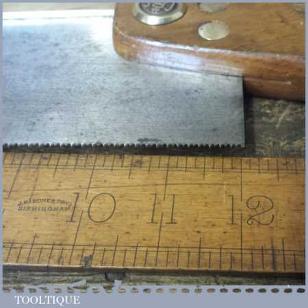 The saw has been thoroughly cleaned including under the handle, jointed, resharpened and set by hand so that all the hard work of getting an old vintage saw right has been undertaken. We do this so that the next sharpening is easier and no more than a quick freshen up would be required. Those who are familiar with sharpening will know this is no small job and requires skill, effort and time to achieve good results.