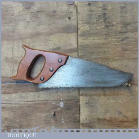 The saw has been thoroughly cleaned, jointed, resharpened and set by hand so that all the hard work of getting an old vintage saw right has been undertaken. We do this so that the next sharpening is easier and no more than a quick freshen up would be required. Those who are familiar with sharpening will know this is no small job and requires skill, effort and time to achieve good results.