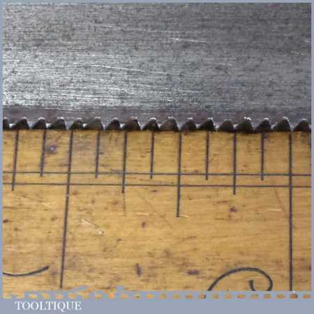 The saw has been thoroughly cleaned, jointed, resharpened and set by hand so that all the hard work of getting an old vintage saw right has been undertaken. We do this so that the next sharpening is easier and no more than a quick freshen up would be required. Those who are familiar with sharpening will know this is no small job and requires skill, effort and time to achieve good results.