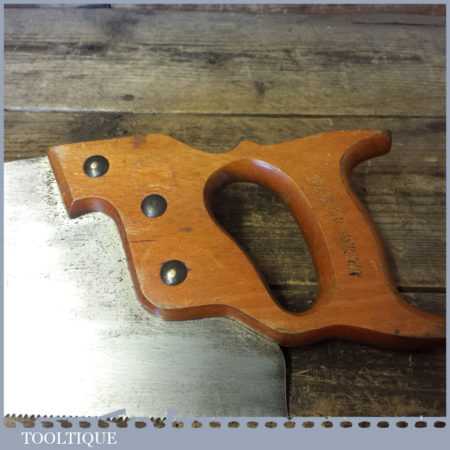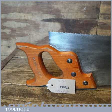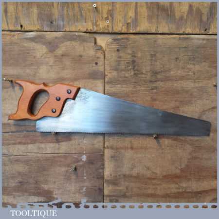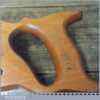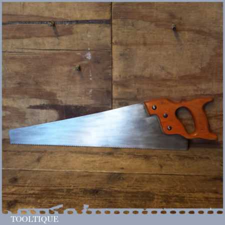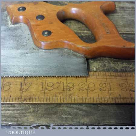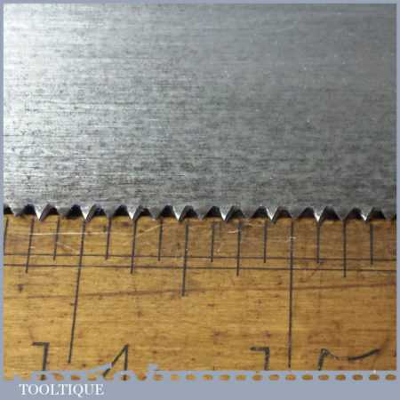 The saw has been thoroughly cleaned, jointed, resharpened and set by hand so that all the hard work of getting an old vintage saw right has been undertaken. We do this so that the next sharpening is easier and no more than a quick freshen up would be required. Those who are familiar with sharpening will know this is no small job and requires skill, effort and time to achieve good results.