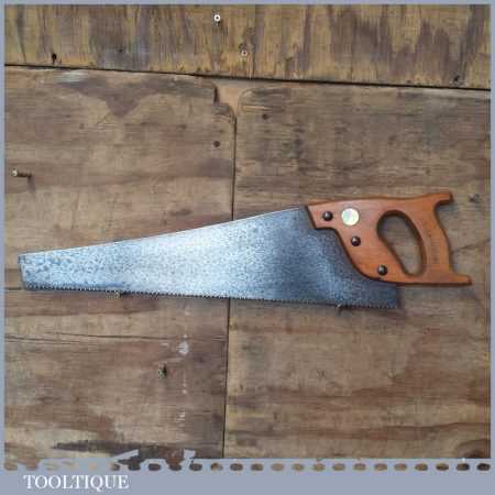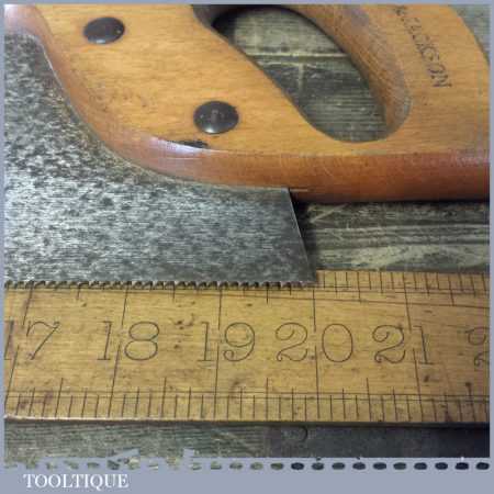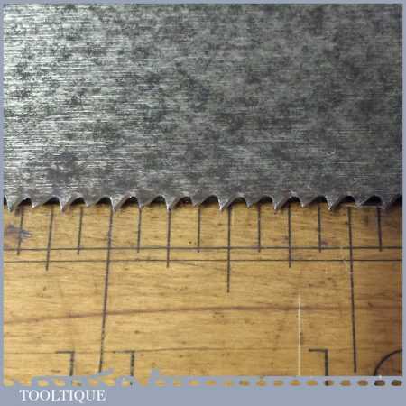 The saw has been thoroughly cleaned, jointed, resharpened and set by hand so that all the hard work of getting an old vintage saw right has been undertaken. We do this so that the next sharpening is easier and no more than a quick freshen up would be required. Those who are familiar with sharpening will know this is no small job and requires skill, effort and time to achieve good results.