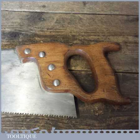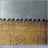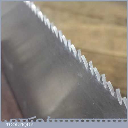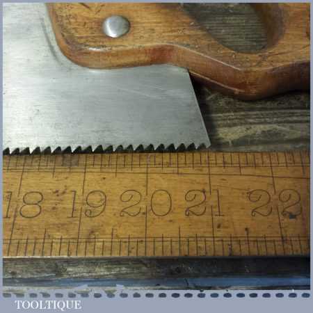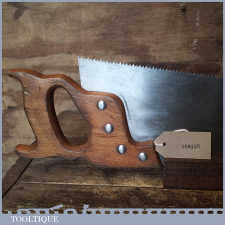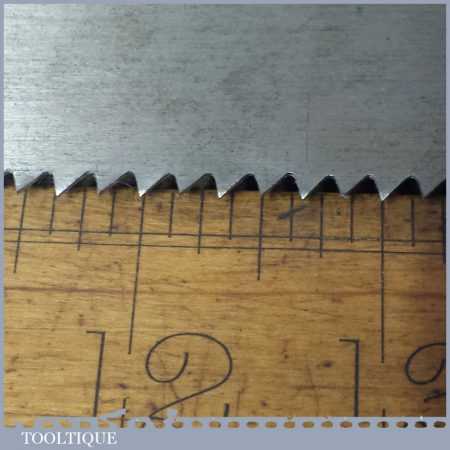 The saw has been thoroughly cleaned, jointed, resharpened and set by hand so that all the hard work of getting an old vintage saw right has been undertaken. We do this so that the next sharpening is easier and no more than a quick freshen up would be required. Those who are familiar with sharpening will know this is no small job and requires skill, effort and time to achieve good results.