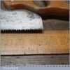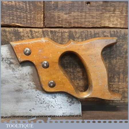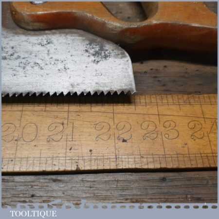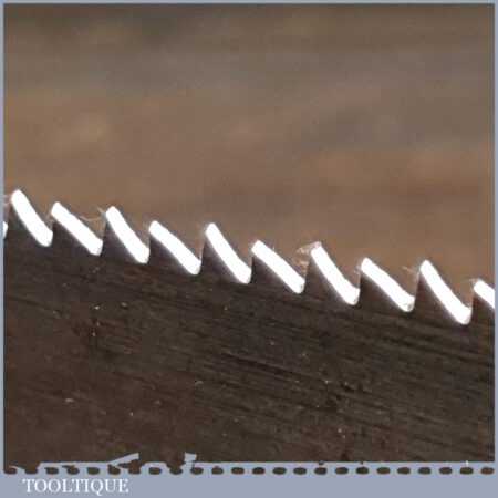 The saw has been thoroughly cleaned, jointed, resharpened and set by hand so that all the hard work of getting an old vintage saw right has been undertaken. We do this so that the next sharpening is easier and no more than a quick freshen up would be required. Those who are familiar with sharpening will know this is no small job and requires skill, effort and time to achieve good results.