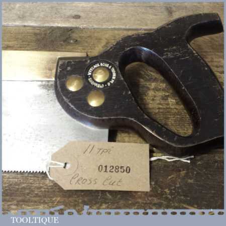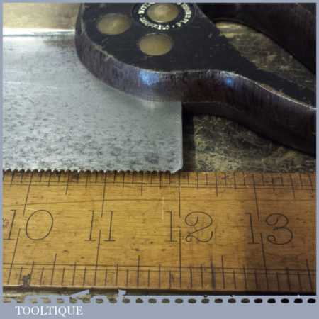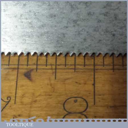 The saw has been thoroughly cleaned, jointed, resharpened and set by hand so that all the hard work of getting an old vintage saw right has been undertaken. We do this so that the next sharpening is easier and no more than a quick freshen up would be required. Those who are familiar with sharpening will know this is no small job and requires skill, effort and time to achieve good results.