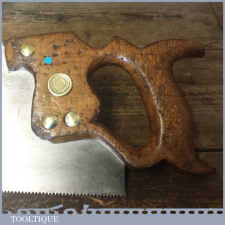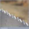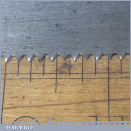 The saw has been thoroughly cleaned, jointed, resharpened and set by hand so that all the hard work of getting an old vintage saw right has been undertaken. We do this so that the next sharpening is easier and no more than a quick freshen up would be required. Those who are familiar with sharpening will know this is no small job and requires skill, effort and time to achieve good results.
