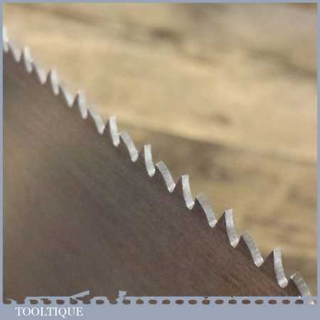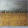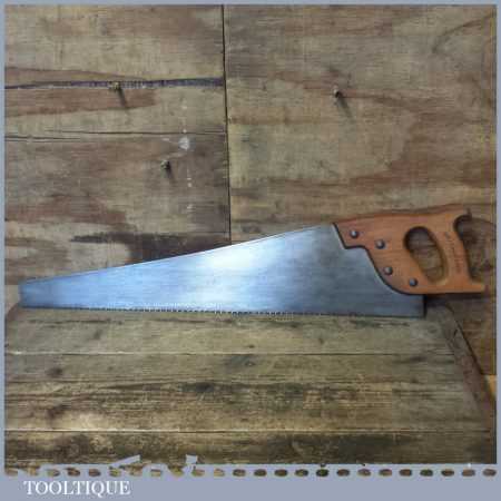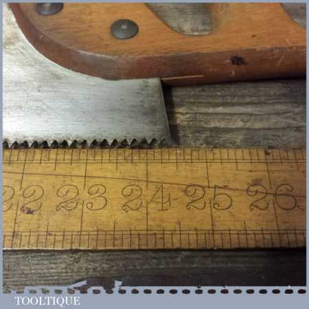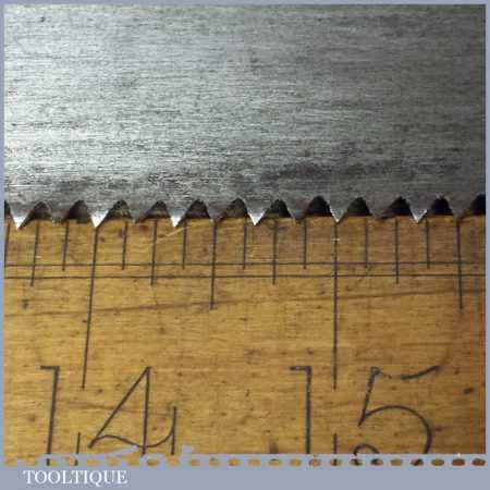 The saw has been thoroughly cleaned, jointed, resharpened and set by hand so that all the hard work of getting an old vintage saw right has been undertaken. We do this so that the next sharpening is easier and no more than a quick freshen up would be required. Those who are familiar with sharpening will know this is no small job and requires skill, effort and time to achieve good results.