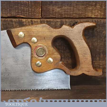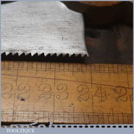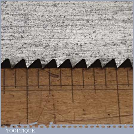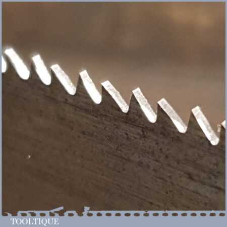 The saw has been thoroughly cleaned, jointed, resharpened and set by hand so that all the hard work of getting an old vintage saw right has been undertaken. We do this so that the next sharpening is easier and no more than a quick freshen up would be required. Those who are familiar with sharpening will know this is no small job and requires skill, effort and time to achieve good results.
