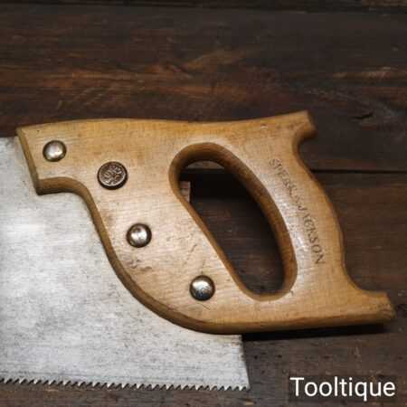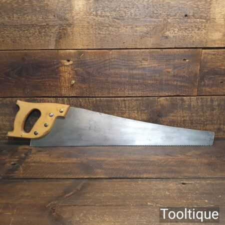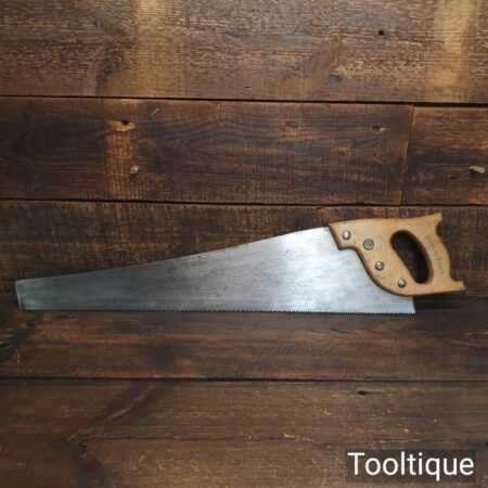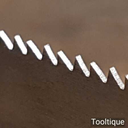 The saw has been thoroughly cleaned, jointed, resharpened and set by hand so that all the hard work of getting an old vintage saw right has been undertaken. We do this so that the next sharpening is easier and no more than a quick freshen up would be required. Those who are familiar with sharpening will know this is no small job and requires skill, effort and time to achieve good results.