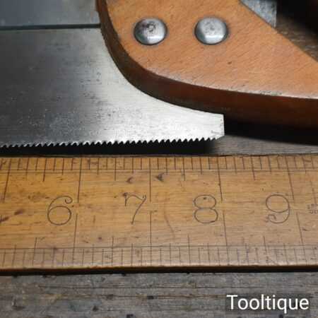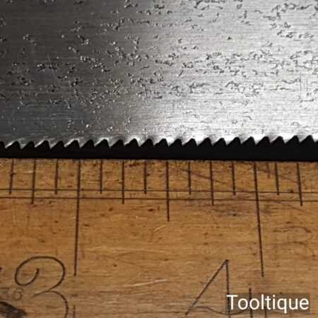 The saw has been thoroughly cleaned including under the handle, jointed, resharpened and set by hand so that all the hard work of getting an old vintage saw right has been undertaken. We do this so that the next sharpening is easier and no more than a quick freshen up would be required. Those who are familiar with sharpening will know this is no small job and requires skill, effort and time to achieve good results