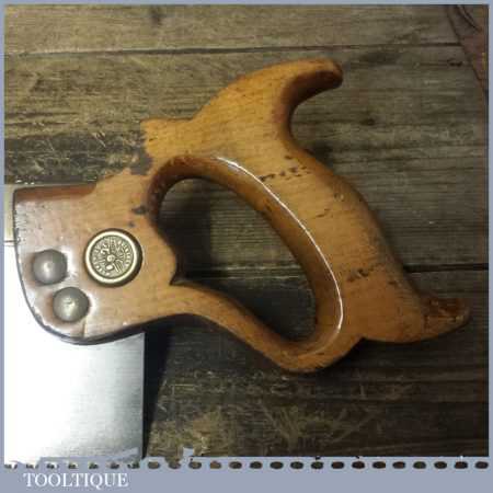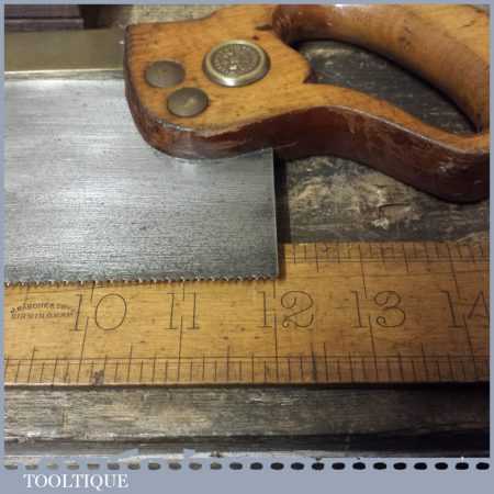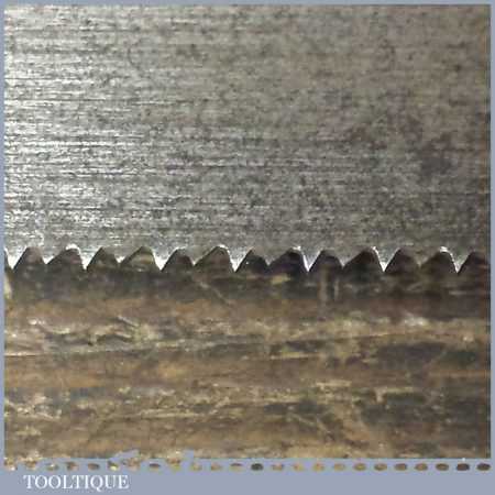 The saw has been thoroughly cleaned, jointed, resharpened and set by hand so that all the hard work of getting an old vintage saw right has been undertaken. We do this so that the next sharpening is easier and no more than a quick freshen up would be required. Those who are familiar with sharpening will know this is no small job and requires skill, effort and time to achieve good results.